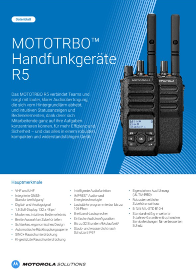 Mit lauter Audioübertragung, fortschrittlicher Geräuschunterdrückung, klaren Statusanzeigen und dedizierten Hardwaresteuerungen bietet MOTOTRBO R5 eine zuverlässige, teamübergreifende Kommunikation und trägt so zu mehr Effizienz und Sicherheit für die Mitarbeitenden bei. Und dank Zertifizierung nach MIL-STD-810 und Schutzart IP67 ist das R5 robust genug, um alltägliche Stöße und Stürze zu überstehen.
