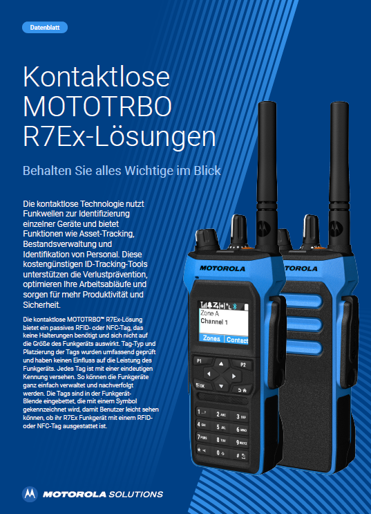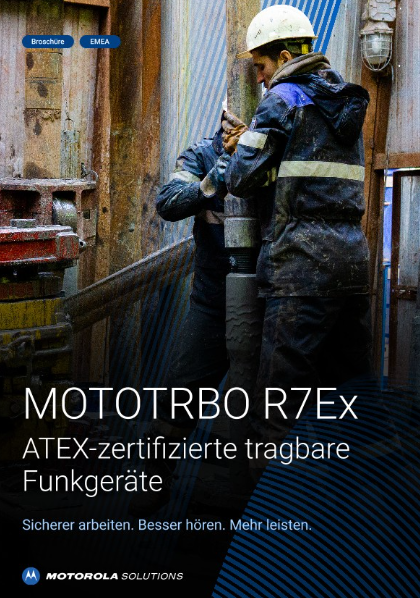 Das eigensichere MOTOTRBO Handfunkgerät R7Ex ist ATEX- und IECEx-zertifiziert für den Einsatz in Gefahrenbereichen. Es ist staub- und wasserdicht und hält rauen Umgebungen stand. Außerdem liefert es laute, klare Audioqualität, um Ausfallzeiten durch verbesserte Arbeitssicherheit und Produktivität zu reduzieren.