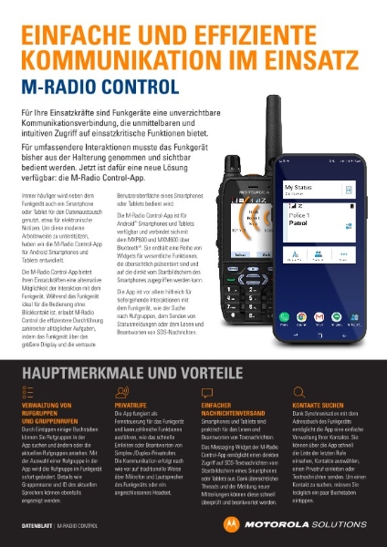 Die M-Radio Control-App ist für Android™-Smartphones und -Tablets verfügbar und verbindet sich mit dem MXP600 und MXM600 über Bluetooth®. Sie enthält eine Reihe von Widgets für wesentliche Funktionen, die übersichtlich präsentiert sind und auf die direkt zugegriffen werden kann. Die App ist vor allem hilfreich für tiefergehende Interaktionen mit dem Funkgerät, wie der Suche nach Rufgruppen, dem Senden von Statusmeldungen oder dem Lesen und Beantworten von SDS-Nachrichten.