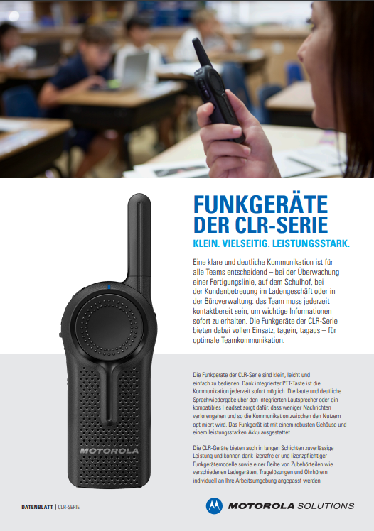 Die Funkgeräte der CLR-Serie sind klein, leicht und einfach zu bedienen mit Sprechfunktion per Tastendruck (PTT) für unmittelbare Kommunikation. Die laute und deutliche Sprachwiedergabe über den integrierten Lautsprecher oder ein kompatibles Headset sorgt dafür, dass weniger Nachrichten verlorengehen und so die Kommunikation zwischen den Nutzern optimiert wird. Das Funkgerät ist mit einem robusten Gehäuse und einem leistungsstarken Akku ausgestattet.
