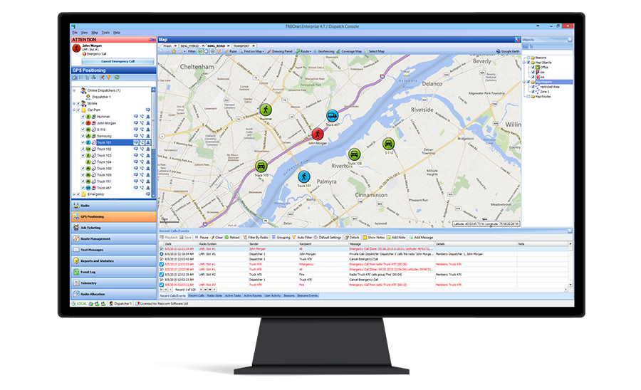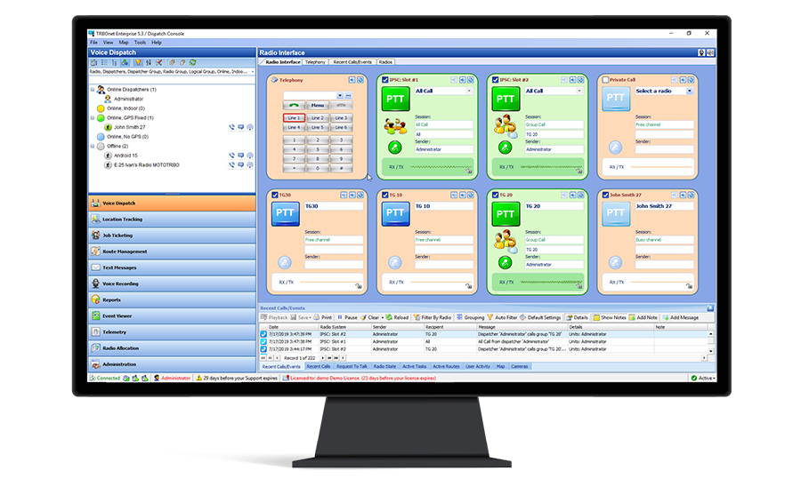 TRBOnet Enterprise is a feature-rich Windows-based compuer aided dispatch system for MOTOTRBO™ and DIMETRA™ Express two-way radio networks. Certain analog and non-MOTOTRBO channels including TETRA can also be monitored. The software supports both wireline and wireless connections to MOTOTRBO™ infrastructure.