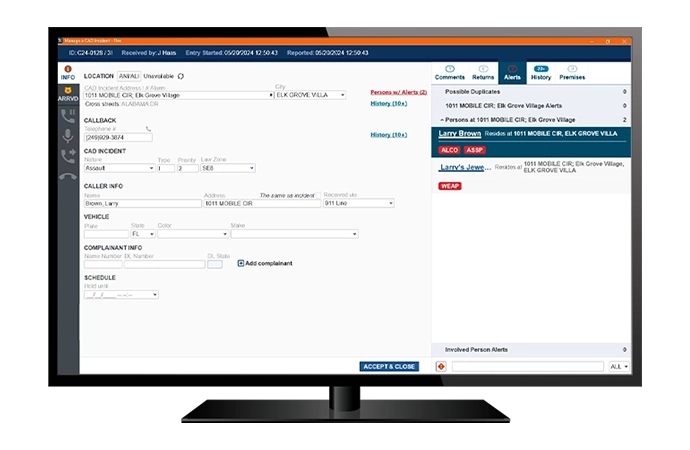 Flex’s tightly integrated system provides dispatchers easy access to critical data like name, vehicle, and law incident records from just one screen. All information dispatchers add can be seen in real-time by responding personnel, boosting situational awareness and field reporting accuracy.