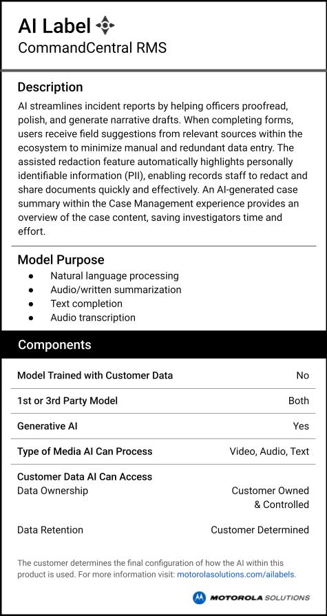 AI labels provide information on if and how CommandCentral RMS leverages artificial intelligence. Learn more