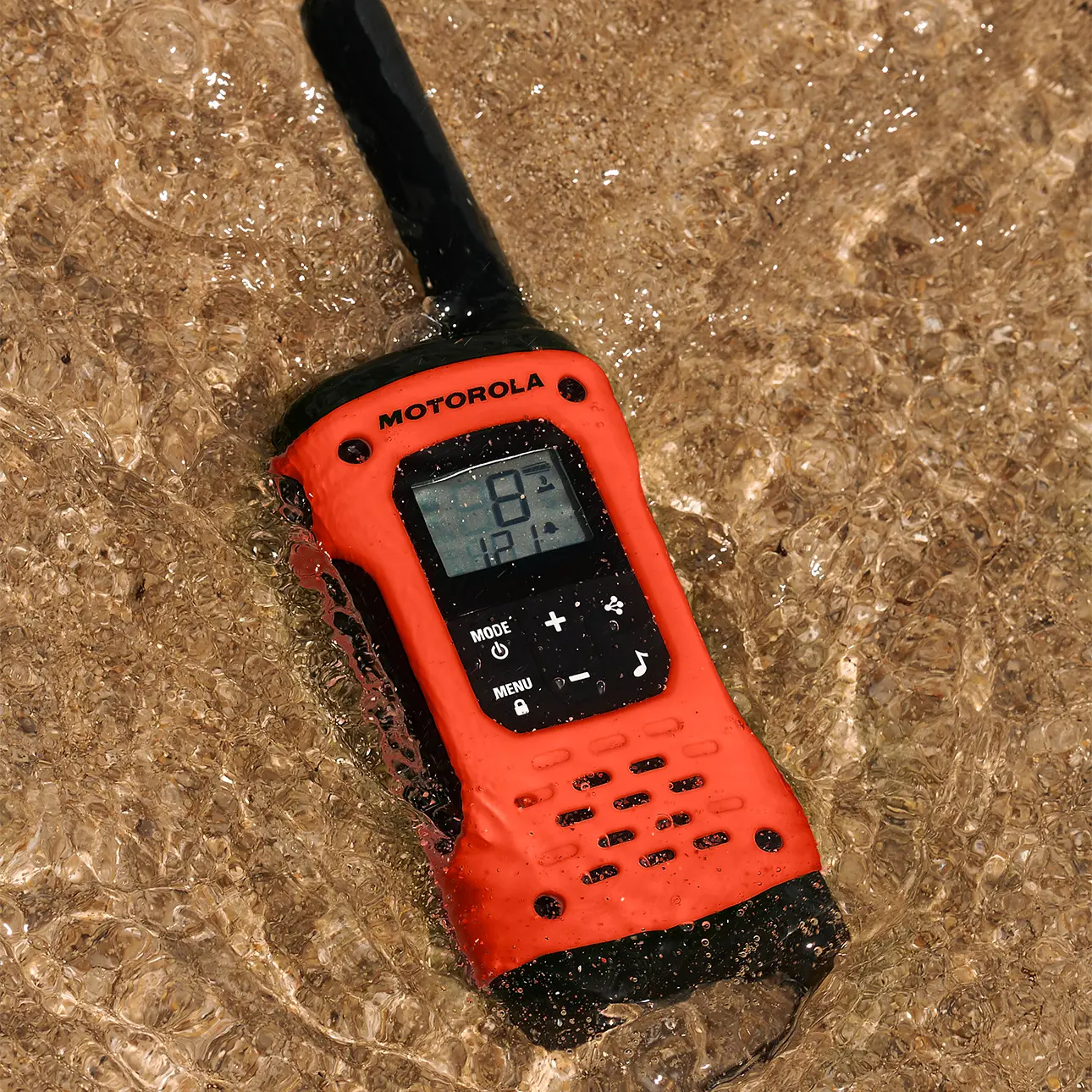 **This radio meets IP67 standards. It will withstand submersion of up to 1m for 30 minutes. Radio floats with included NiMH battery. It may not float with some AA batteries. Use of headset should be in dry environments.