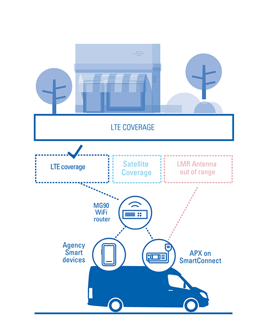 Whenever you exit your radio system’s range, the Connected Vehicle delivers Automatic Voice Connectivity via LMR, WiFi, LTE or Satellite, ensuring your talk groups and security remain active.