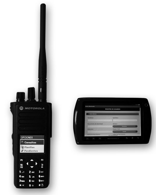 Devices in the field can be portable radios like DGP8550 or DGP5550, mobile computing devices, Tablets or smartphones, portable printers, bar code scanners, etc. The devices, different to radios, employ Bluetooth connectivity to interact with the radios that act like gateways and with the system.