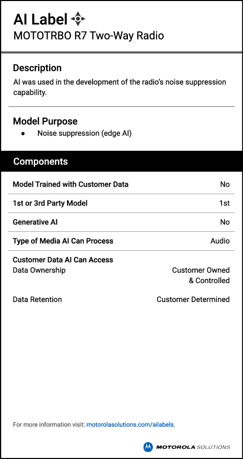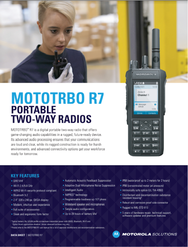MOTOTRBO R7 is your entry point to our integrated technology ecosystem, where your voice, video, data and analytics are unified on a single enterprise platform. Learn more about how our solutions work together in more powerful ways to maximize your technology investments with Safety Reimagined.