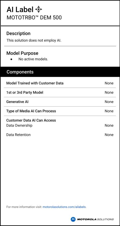 AI labels provide information on if and how MOTOTRBO DEM 500 leverages artificial intelligence. Learn more