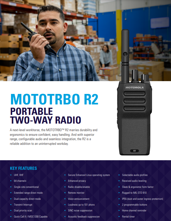 MOTOTRBO R2 is the ultimate workhorse. Engineered to minimize downtime with a simplified user experience, foolproof ergonomics and low-cost migration, the R2 helps you manage your day to day operations without skipping a beat.
