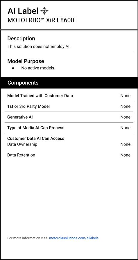 AI labels provide information on if and how MOTOTRBO XiR E8600i leverages artificial intelligence. Learn more