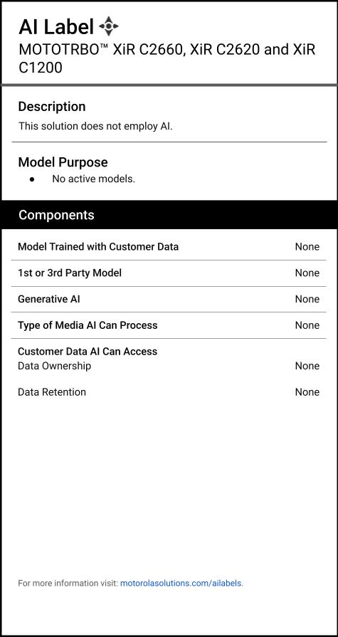 AI labels provide information on if and how MOTOTRBO XiR C2660, XiR C2620 and XiR C1200 leverages artificial intelligence. Learn more