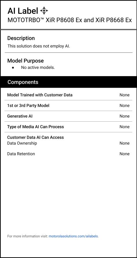 AI labels provide information on if and how MOTOTRBO XiR P8608 Ex and XiR P8668 Ex leverages artificial intelligence. Learn more
