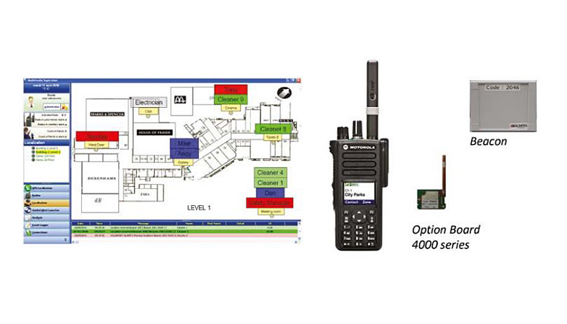 It allows the management of different teams such as technical, security and cleaners, with all radio movements being tracked and recorded throughout the site and stored on the server. Localisation of staff is done thanks to wireless beacons which are battery powered meaning no third party network is required, and location is displayed on a multi floor layout map GUI combining staff location and other alarms.