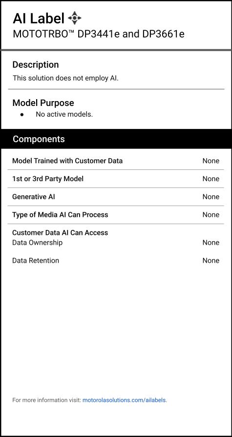 AI labels provide information on if and how MOTOTRBO DP3441e and DP3661e leverages artificial intelligence. Learn more