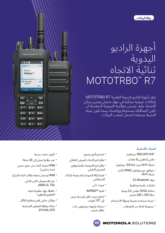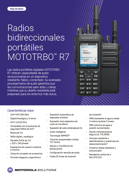 MOTOTRBO™ R7 is a digital portable two-way radio that offers loud, clear, and customisable audio in a rugged, dependable, and connected device. Its advanced audio processing ensures that your voice is always understood, while the rugged construction is ready for the toughest environments. Additionally, R7 comes equipped with the latest Wi-Fi and Bluetooth® connectivity options meaning your devices are ready for tomorrow as your systems grow.