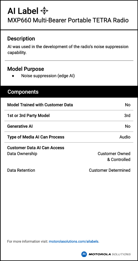 Clarity of voice communication is critical to get vital messages across. Noise reduction technology, trained through AI machine-learning, is integrated in the MXP660 to suppress background noise and improve clarity of calls – so users can be heard, even in noisy conditions.