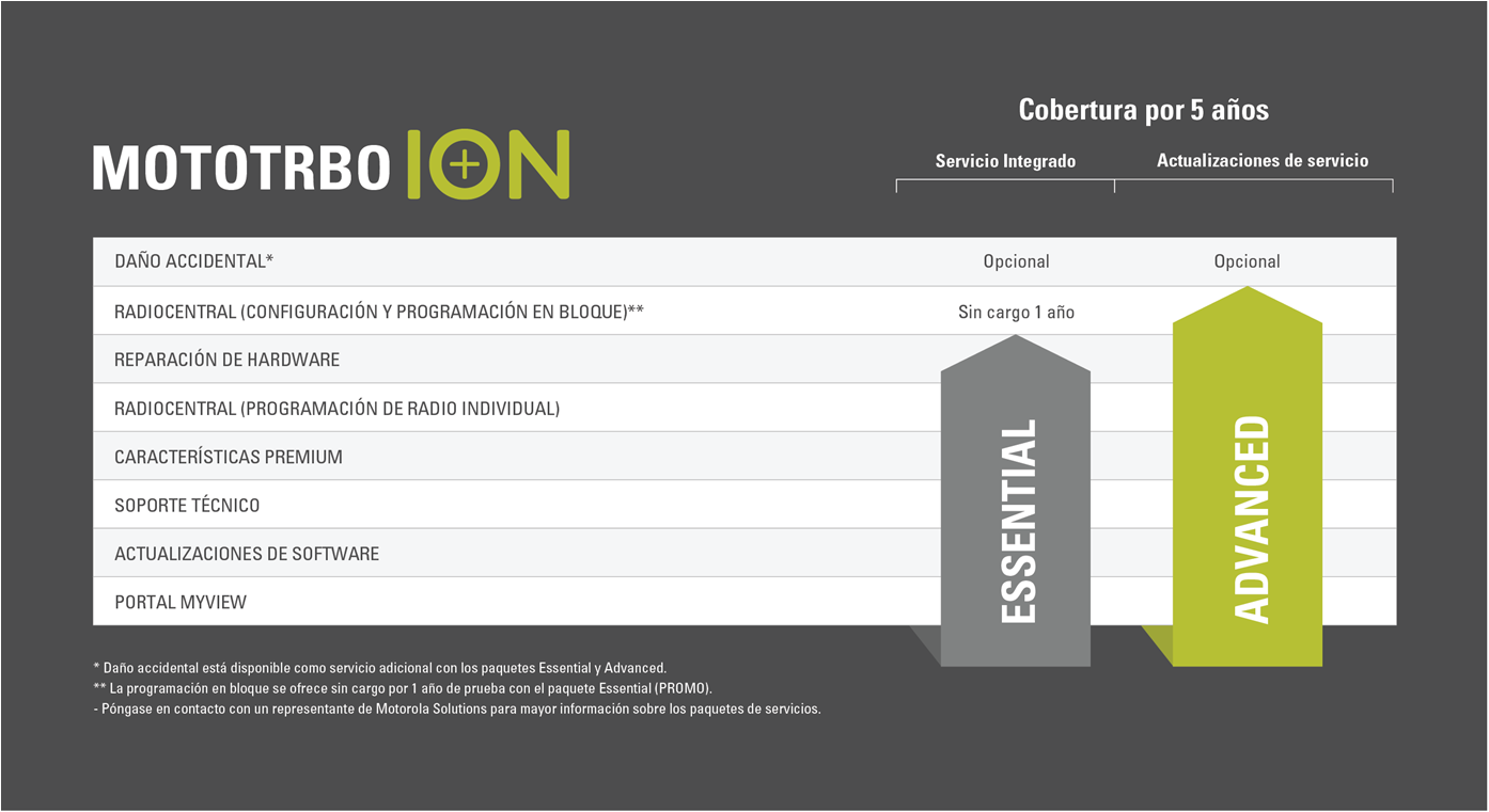 Garantice una seguridad, rendimiento y funcionalidad mejorada continuos en su radio inteligente crítica para los negocios Mototrbo Ion al obtener acceso a las mejoras y actualizaciones de los lanzamientos de software ya probados. Las actualizaciones frecuentes en los lanzamientos de software protegen y amplían las operaciones para extender la vida útil de su dispositivo portátil. Las actualizaciones planeadas pueden ayudarle a minimizar los costos imprevistos y las interrupciones del servicio, así como puede aumentar las capacidades de los radios inteligentes MOTOTRBO Ion para obtener un incremento en la productividad, confiabilidad y seguridad.
