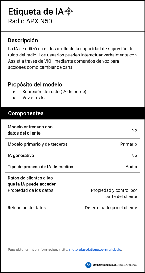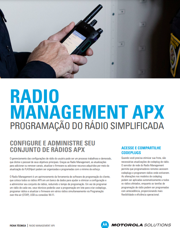APX N50 es un radio fácil de trasladar, delgado y resistente, diseñado para brindar comunicaciones seguras en el campo al personal administrativo y de emergencia y a los funcionarios de seguridad pública. Proporciona una organización simple, un audio fuerte, encriptación de hardware MACE y capacidades de programación por lote eficientes para mantener a su flota conectada y, además, fomentar la colaboración en cualquier momento y lugar.
