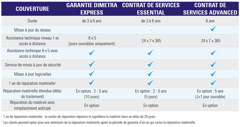 DIMETRA Express est conçu et réalisé pour garantir des performances durables et dispose d'une garantie standard de trois ans qui assure les mises à jour logicielles de la dernière version, les mises à jour de sécurité pour une plus grande protection, une assistance technique si un problème survient, une réparation matérielle (standard d'un an, extensible à trois ans). La garantie prévoit :