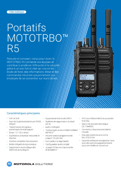 Grâce à un son puissant, une suppression avancée du bruit, des indicateurs d'état clairs et des commandes matérielles dédiées, le MOTOTRBO R5 fournit à vos équipes des communications fiables qui améliorent l'efficacité et la sécurité de vos employés. Les certifications IP67 et MIL-STD-810 garantissent à la R5 une robustesse suffisante pour résister aux chocs et aux chutes quotidiens.