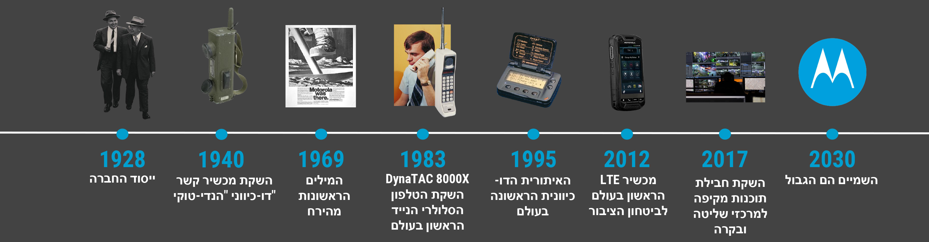 איש לא יכול היה להעלות על הדעת שהחברה למכשירי רדיו למכוניות, שייסד פול גלווין בשנת 1928, תהפוך יום אחד לספקית מובילה של פתרונות תקשורת למשימות קריטיות לביטחון הציבור וללקוחות מסחריים. בסביבה העסקית והדינמית של היום מעטות החברות שזוכות לציין 90 שנות פעילות. צוות מוטורולה סולושנס גאה לשתף ברגע הנפלא הזה את לקוחותינו ושותפינו ברחבי העולם.