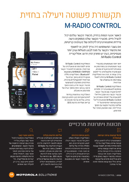 האפליקציה M-Radio Control זמינה לטלפונים חכמים וטאבלטים של אנדרואיד, ומתחברת למכשירי הקשר MXP600 ו-MXM600 באמצעות Bluetooth®. האפליקציה כוללת מגוון ווידג'טים של אנדרואיד במסך הבית, לפונקציות השימושיות ביותר. הווידג'טים מספקים למשתמשים מידע במבט חטוף וגישה בנגיעה אחת. האפליקציה שימושית במיוחד לפעולות כגון: חיפוש קבוצות שיחה, שליחת עדכוני סטטוס או הודעות SDS.