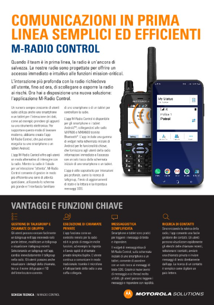 L'app M-Radio Control è disponibile per gli smartphone e i tablet Android™, collegandosi alle radio MXP600 e MXM600 tramite Bluetooth®. L'app presenta una gamma di widget nella schermata iniziale di Android per le funzionalità chiave, che forniscono agli utenti informazioni immediate e l'accesso con un solo tocco. L'app è utile soprattutto per interazioni più profonde, come la ricerca di talkgroup, l'invio di aggiornamenti di stato o la lettura e la risposta a messaggi SDS.