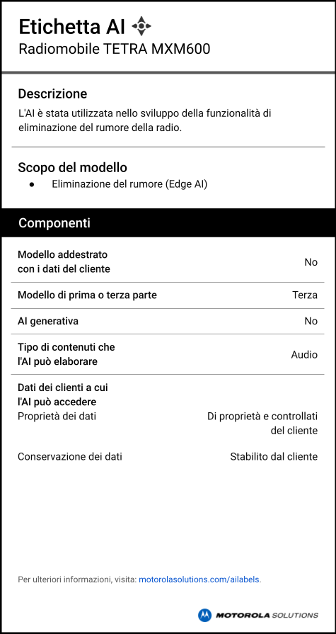 La chiarezza delle comunicazioni vocali è fondamentale quando si tratta di trasmettere messaggi di importanza vitale. La tecnologia di riduzione del rumore, ottimizzata dal machine learning basato sull'intelligenza artificiale, è integrata nella radio MXM600 al fine di eliminare il rumore di fondo e migliorare la nitidezza delle chiamate. In questo modo gli utenti sono in grado di ascoltare ed essere ascoltati anche in ambienti rumorosi.