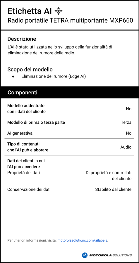 La chiarezza delle comunicazioni vocali è fondamentale per trasmettere messaggi di importanza critica. Al fine di eliminare il rumore di fondo e migliorare la nitidezza delle chiamate, la radio MXP660 è dotata di tecnologia di riduzione del rumore basata sull'apprendimento automatico con intelligenza artificiale. In questo modo, gli utenti sono in grado di ascoltare ed essere ascoltati anche in ambienti rumorosi.
