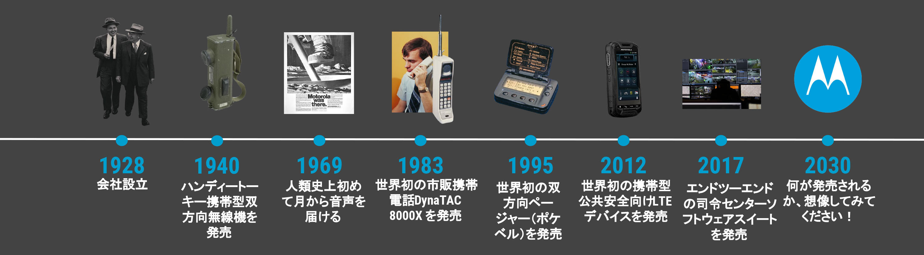 1928年にポール・ガルビンが興したカーラジオの会社が、その将来、公共や企業のお客様へミッション・クリティカルな通信や映像監視のソリューションを提供する、業界を代表する会社になると誰が想像したでしょうか。そして、現代の変化し続ける経済環境の中で、90周年を迎えられる会社はそう多くはありません。私たちは、この輝かしい時をお客様やパートナーの皆様と共に迎えられることに、深く喜びを感じています。