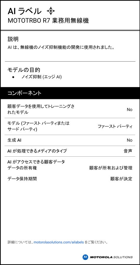 MOTOTRBO R7は頑丈。カスタマイズされた音声通信でチームを継続してつなぎます。ダウンタイムを最小限に抑えるセキュリティ機能で安心、効率的なデバイスです。