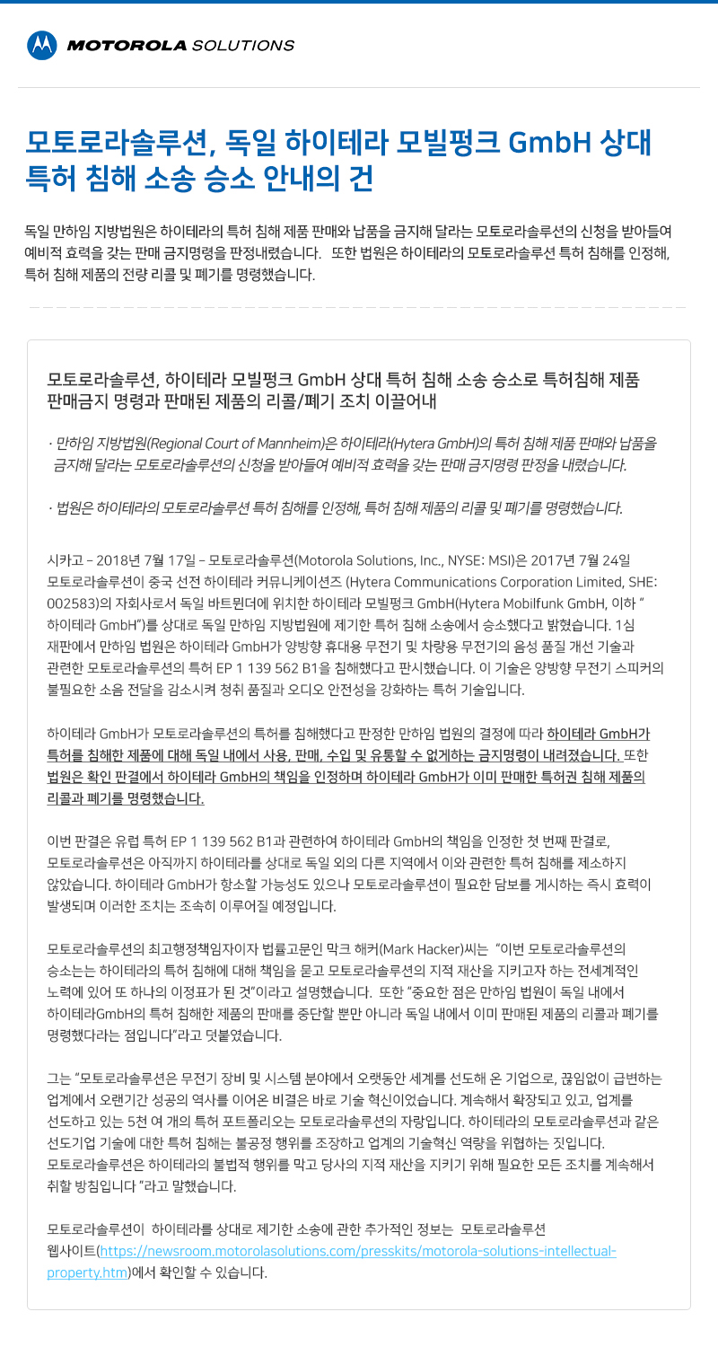 모토로라솔루션, 독일 하이테라 모빌펑크 GmbH 상대 특허 침해 소송 승소