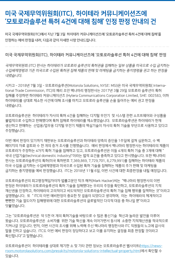미국 국제무역위원회(ITC), 하이테라 커뮤니케이션즈에 '모토로라솔루션 특허 4건에 대해 침해' 인정 판정
