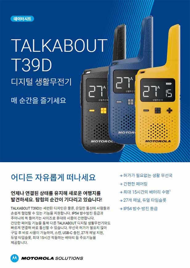 TALKABOUT T39D는 세련된 디자인은 물론, 은밀한 통신에 사람들과 손쉽게 협업할 수 있는 기능을 지원합니다. IP54 방수방진 등급과 주머니에 쏙 들어가는 사이즈로 휴대와 사용이 간편합니다. 간단한 페어링 기능을 통해 다른 TALKABOUT 디지털 생활무전기와도 빠르게 연결해 바로 통신할 수 있습니다. 무선국 허가가 필요치 않아 구입 후 바로 사용이 가능하며, 스캔, USB-C 충전, 27개 채널 지원, 듀얼 타임슬롯, 최대 15시간 작동하는 배터리 등 주요기능을 제공합니다.
