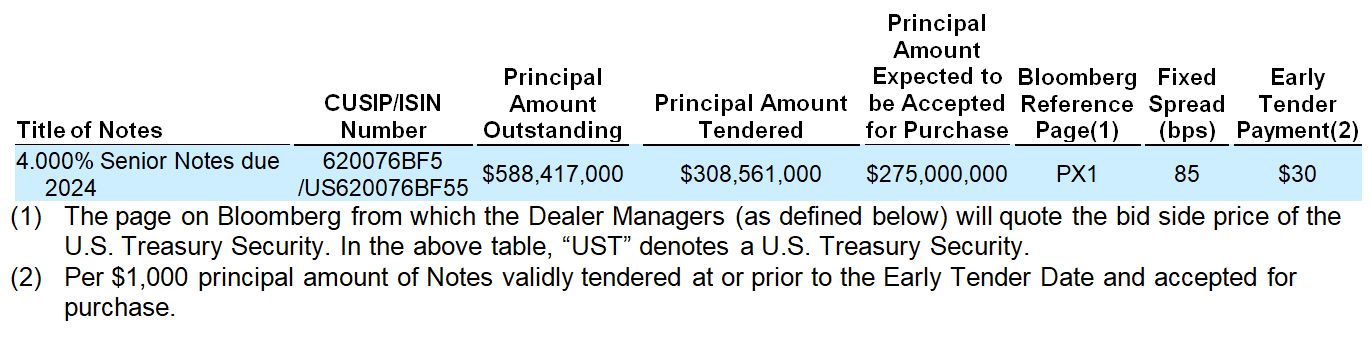 Holders of all Notes validly tendered and not validly withdrawn at or prior to the Early Tender Date and accepted for purchase are eligible to receive the Total Consideration, which includes the Early Tender Payment of $30 per $1,000 principal amount of Notes tendered at or prior to the Early Tender Date (the “Early Tender Payment”). In addition to the Total Consideration, Holders of Notes accepted for purchase will receive accrued and unpaid interest up to, but not including, the Early Settlement Date (“Accrued Interest”).