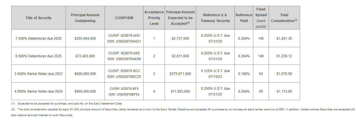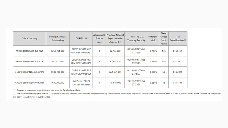 As listed in the table above, the Company expects to accept for purchase, and pay for, $2,737,000 aggregate principal amount of its 7.500% Debentures due 2025, $2,611,000 aggregate principal amount of its 6.500% Debentures due 2025, $275,971,000 aggregate principal amount of its 3.500% Senior Notes due 2023, and $11,583,000 aggregate principal amount of its 4.00% Senior Notes due 2024, on the Early Settlement Date.