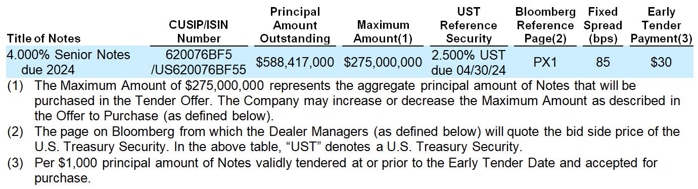 The Maximum Amount represents the aggregate principal amount of Notes subject to the Tender Offer. The Company expressly reserves the right, in its sole discretion, subject to applicable law, to increase or decrease the Maximum Amount, without extending withdrawal rights and/or terminate the Tender Offer at any time prior to the Expiration Date (as defined below). If Holders (as defined below) tender more Notes in the Tender Offer than they expect to be accepted for purchase by the Company based on the Maximum Amount and the Company subsequently accepts more than such Holders expected of such Notes tendered as a result of an increase of the Maximum Amount, such Holders will not be able to withdraw any of their previously tendered Notes. Accordingly, Holders should not tender any Notes that they do not wish to be accepted for purchase.