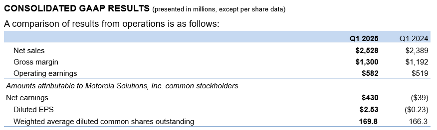 CHICAGO – May 1, 2025 – Motorola Solutions, Inc. (NYSE: MSI) today reported its earnings results for the first quarter of 2025.