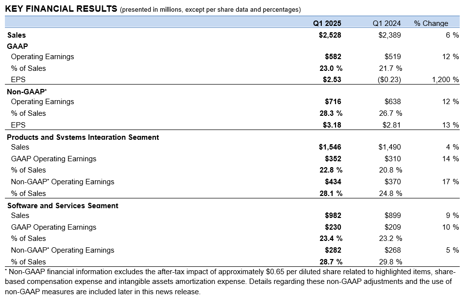 - Operating margin - GAAP operating margin was 23.0% of sales, up from 21.7% in the year-ago quarter. Non-GAAP operating margin was 28.3% of sales, up 160 basis points from 26.7% in the year-ago quarter. The increase in both GAAP and non-GAAP operating margins was driven by higher sales, favorable mix and lower direct material costs, partially offset by acquisitions.