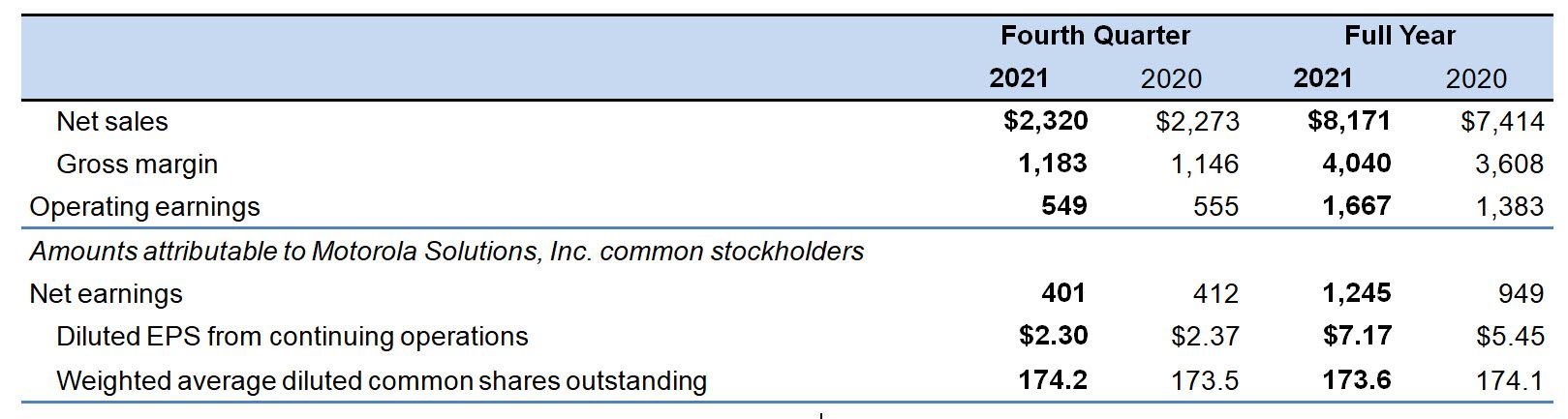 CHICAGO - Feb. 9, 2022 - Motorola Solutions, Inc. (NYSE: MSI) today reported its earnings results for the fourth quarter and full year of 2021. Click here for a printable news release and financial tables.