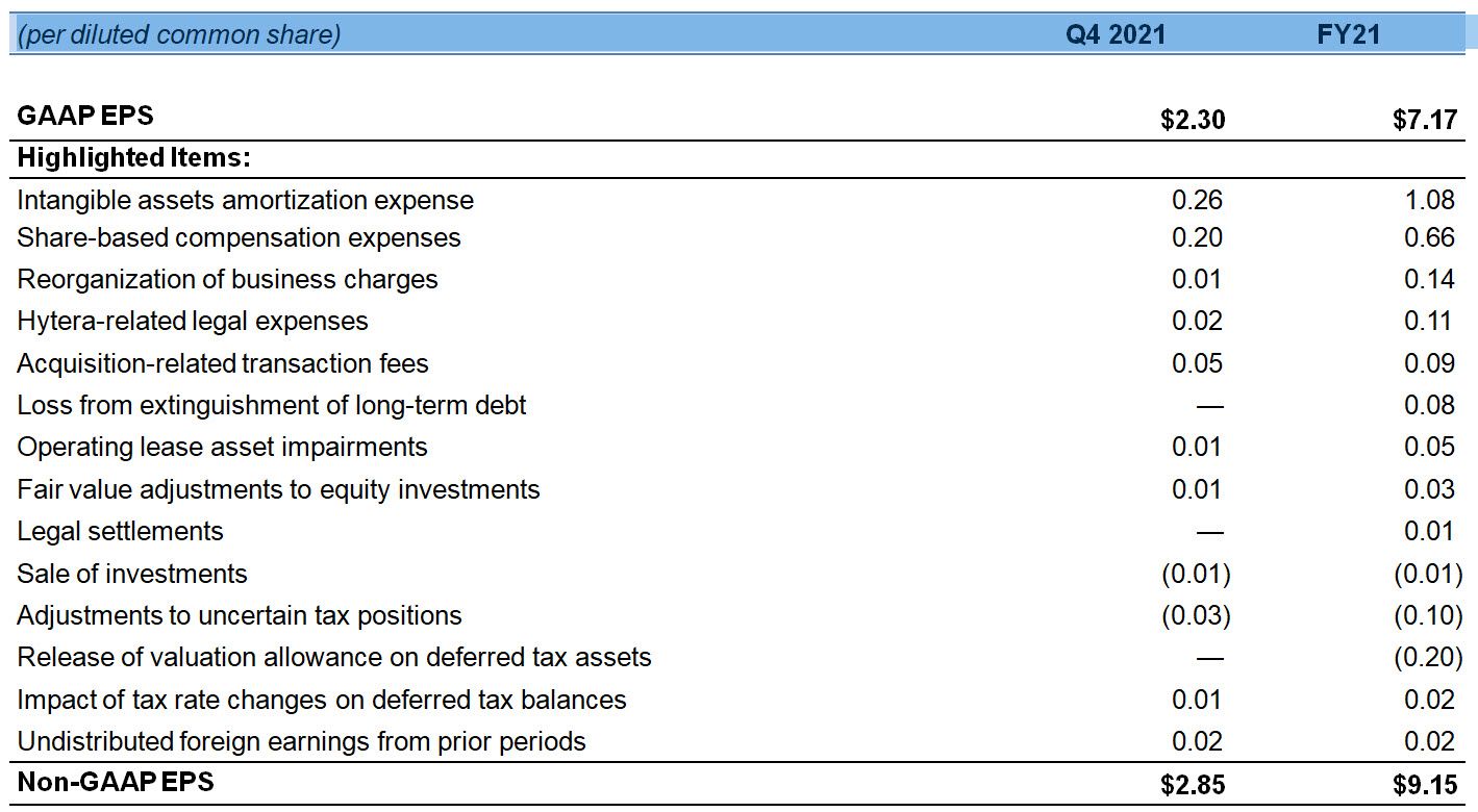 Highlighted items: The company has excluded the effects of highlighted items including, but not limited to, acquisition-related transaction fees, tangible and intangible asset impairments, reorganization of business charges, certain non-cash pension adjustments, legal settlements and other contingencies, gains and losses on investments and businesses, Hytera-related legal expenses, and the income tax effects of significant tax matters, from its non-GAAP operating expenses and net income measurements because the company believes that these historical items do not reflect expected future operating earnings or expenses and do not contribute to a meaningful evaluation of the company's current operating performance or comparisons to the company's past operating performance. For the purposes of management's internal analysis over operating performance, the company uses financial statements that exclude highlighted items, as these charges do not contribute to a meaningful evaluation of the company's current operating performance or comparisons to the company's past operating performance.