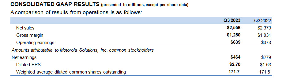 CHICAGO – November 2, 2023 – Motorola Solutions, Inc. (NYSE: MSI) today reported its earnings results for the third quarter of 2023.