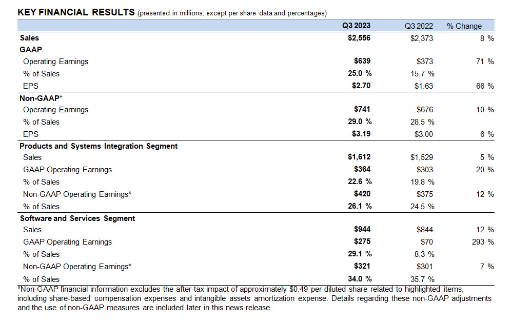 - Fourth quarter 2023 - The company expects revenue growth of approximately 4%, compared to the fourth quarter of 2022. The company expects non-GAAP EPS in the range of $3.60 to $3.65 per share. This assumes approximately 171 million fully diluted shares and a non-GAAP effective tax rate of approximately 24%.