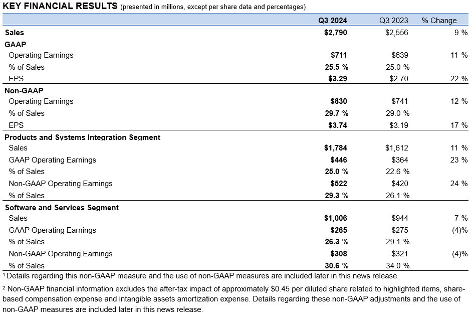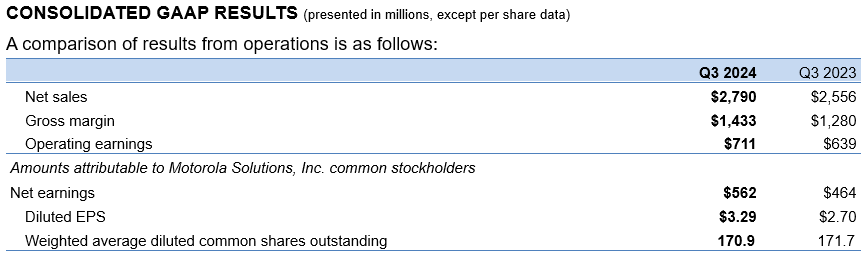 CHICAGO – November 7, 2024 – Motorola Solutions, Inc. (NYSE: MSI) today reported its earnings results for the third quarter of 2024.
