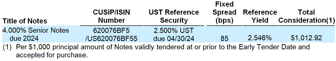 The Total Consideration for each $1,000 principal amount of Notes was determined in the manner described in the Offer to Purchase by reference to the fixed spread set forth in the table above plus the yield to maturity of the U.S. Treasury reference security (the “UST Reference Security”) set forth in the table above on the bid-side price of such UST Reference Security as of 9:00 a.m., New York City time, on June 1, 2022.
