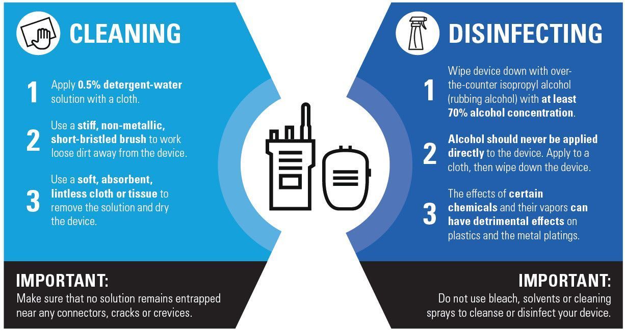 In response to the coronavirus (COVID-19) pandemic, Motorola Solutions is providing recommended cleaning and disinfecting guidelines for our radios, body-worn cameras and accessories based on our current and best understanding of radio hygiene. Per global health authorities, removing germs, dirt and impurities from surfaces lowers the risk of spreading infection. Using chemical disinfectants may kill germs that remain on surfaces after cleaning, which further lowers the risk of spreading infection.