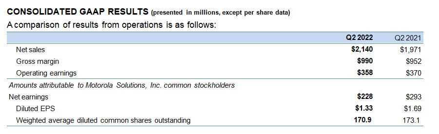 CHICAGO – August 4, 2022 – Motorola Solutions, Inc. (NYSE: MSI) today reported its earnings results for the second quarter of 2022.