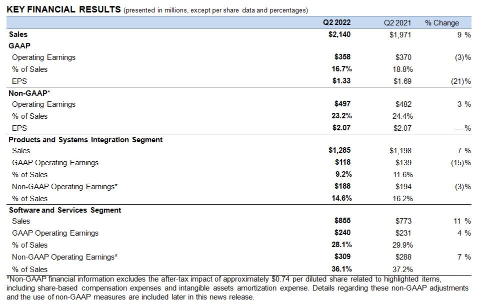- Backlog - The company ended the quarter with record Q2 backlog of $13.4 billion, up 19% or $2.2 billion from the year-ago quarter, inclusive of $496 million of unfavorable currency. Products and Systems Integration segment backlog was up 30%, or $986 million. The growth was primarily driven by strong LMR and video demand. Software and Services segment backlog was up 15% or $1.2 billion, driven by the extension of the Airwave contract in the fourth quarter of 2021 and an increase in multi-year software and services contracts in North America, partially offset by $436 million of unfavorable currency.