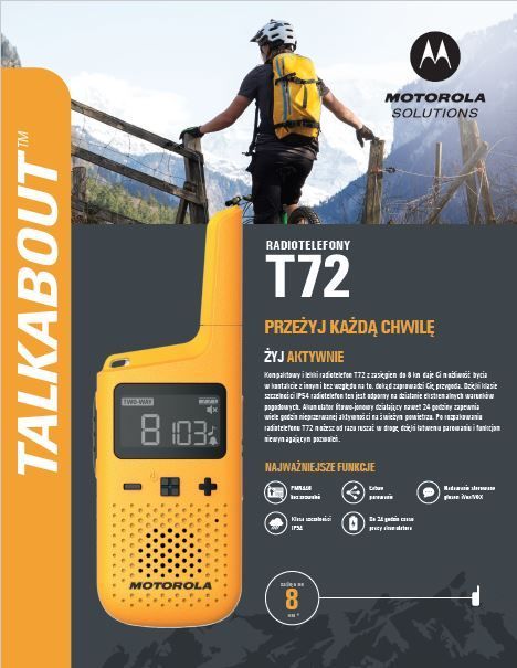 Radiotelefon TALKABOUT T72 pozwala utrzymać połączenie bez względu na okoliczności. Dzięki klasie odporności na warunki atmosferyczne IP54 jest odporny na działanie ekstremalnych warunków pogodowych. Akumulator litowo-jonowy działający nawet 24 godziny zapewnia wiele godzin nieprzerwanej aktywności na świeżym powietrzu. Po rozpakowaniu radiotelefonu T72 możesz od razu ruszać w drogę dzięki łatwemu parowaniu i funkcjom niewymagającym zezwolenia.