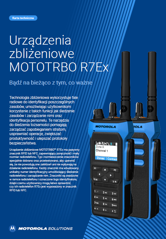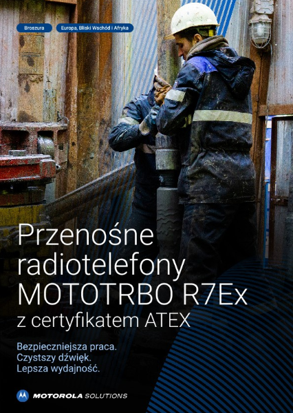 Radiotelefon MOTOTRBO R7Ex o samoistnie bezpiecznej konfiguracji ma certyfikaty ATEX i IECEx do użytku w środowiskach niebezpiecznych. Jest pyłoszczelny i wodoodporny, dzięki czemu może być używany w trudnych warunkach, oraz zapewnia głośny, wyraźny dźwięk, co pomaga skrócić przestoje dzięki zwiększonemu bezpieczeństwu i produktywności pracowników.